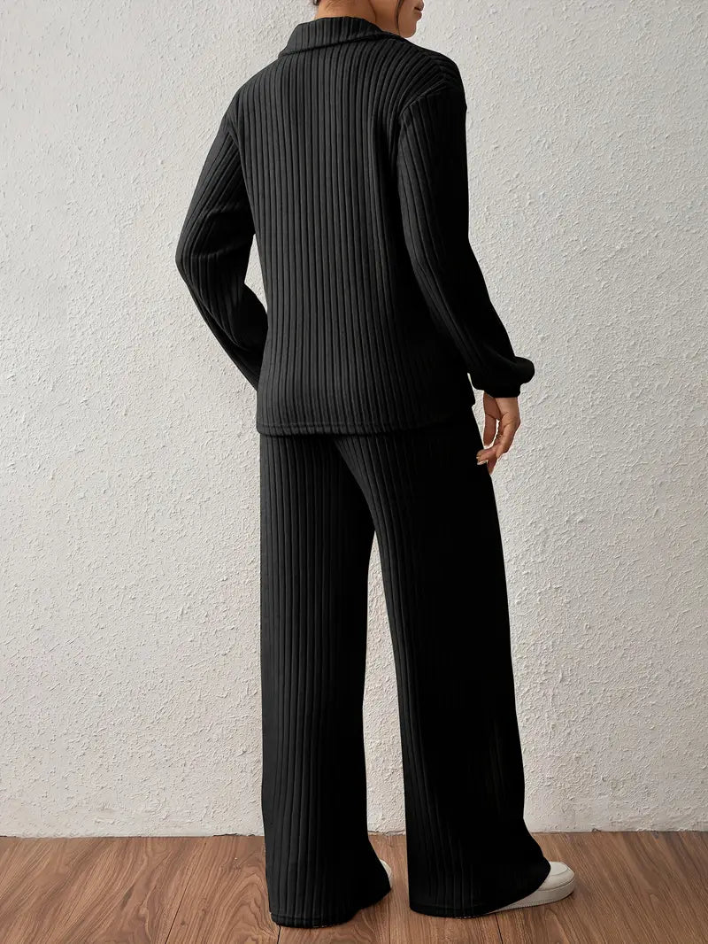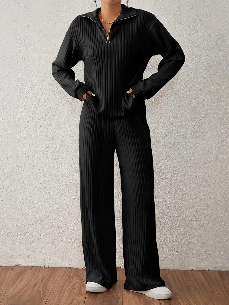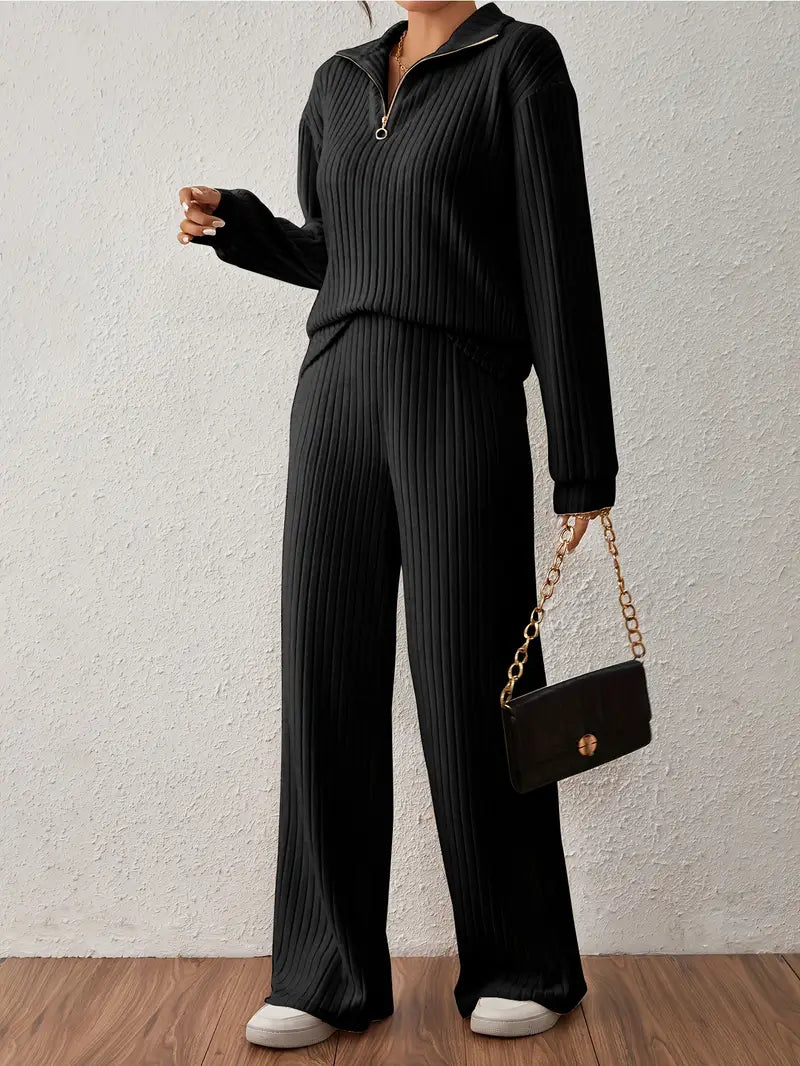Timeless design: A chic half-zip top paired with wide-leg pants creates a look that’s both modern and classic.