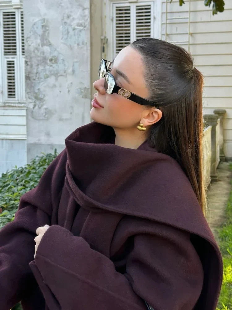 The Michella Cape Coat is the perfect choice for style-conscious women who appreciate both comfort and elegance. With its chic shawl collar and tailored belt, this coat combines modern style with the necessary warmth for the cooler months. The long cut and loose fit make it ideal for relaxed days as well as for special occasions.